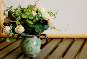 卧室是睡眠休息的场所,插花布置宜简洁、文静、淡雅。卧室的墙面、顶以及窗帘的色彩大都为统一基调,因此插花要在变化中求统一,才能达到理想的效果。卧室里应选择让人感觉质地温馨的花瓶,比如陶质、木质花瓶。