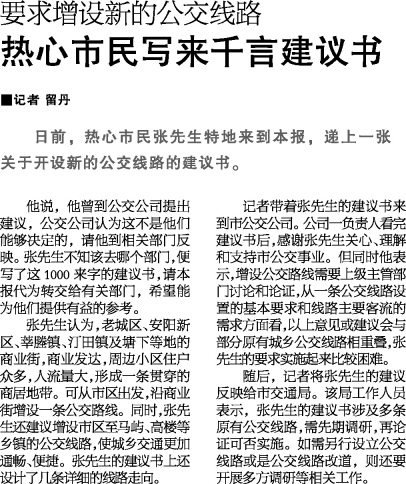 日前,热心市民张先生特地来到本报,递上一张关于开设新的公交线路的建议书。