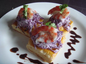 做法:用面粉、黄油做成四方形酥皮,入烤箱中烤成酥状;将九节虾焯熟去壳,改刀待用;用自制沙律酱将紫球菜丝拌匀放在酥皮上,将改好的虾仁整齐摆放在紫球菜丝上,放上香菜装饰即可。此菜成菜特点:酥皮层次分明,鲜虾拌沙拉,口感爽滑。