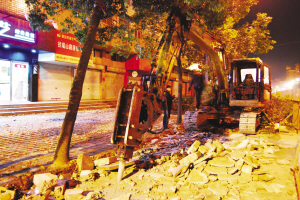 当晚22时15分许,记者来到新世纪大厦前,工地现场,一辆装了破碎锤的挖掘机正往地面上打孔(如图)。