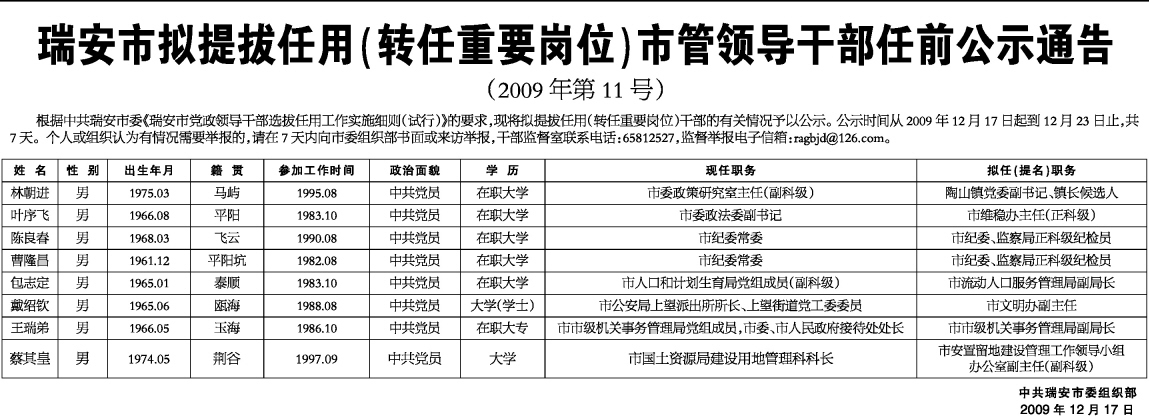 瑞安市拟提拔任用(转任重要岗位)市管领导干部任前公示通告(2009年第11号)