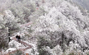 昨日,海拔1320米、有“东瓯第一峰”之称的金鸡山旅游区出现一派银装素裹的雾凇景观。