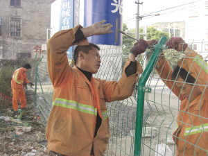 昨天下午14时许,该中队和甬台温高速公路有限公司养护人员来到现场。养护人员清理了垃圾,并重新将铁丝网安放在绿化带里(见图)。