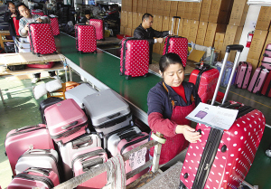 昨日,我市箱包龙头企业——鸿一箱包公司的生产车间内一片忙碌景象,员工们正在赶制一批11.5万只彩色PPC拉链箱,准备出口欧美国家。据了解,在国际金融危机影响下,我市箱包企业积极开展产品研发工作,推动转型升级,提高产品的市场竞争力。今年10月份以来,我市箱包企业逐步回暖,单从广州秋交会上就获得出口订单3亿元。 (记者 庄颖昶)
