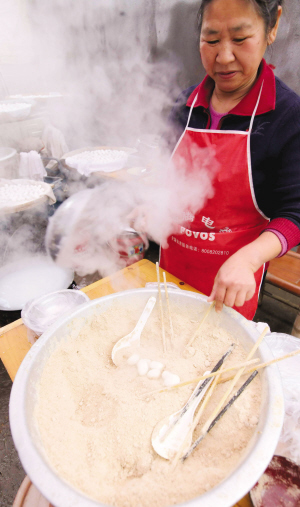 做麻糍要先把糯米炊熟,捣韧,做成块形,然后放在加糖的豆粉中滚动使之粘满豆粉即成,俗称“擂麻糍”。吃麻糍、汤圆,寓意着团圆和喜庆,民间有“吃了冬至丸,就算长一岁”的说法。 (庄颖昶 方孔德)