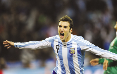 伊瓜因——阿根廷前锋,23岁,效力于西甲皇家马德里队。伊瓜因是一位拥有法国国籍的阿根廷人,但他最终选择了阿根廷国家队。无论在国家队还是在皇马,伊瓜因都被放到突前的位置上,他异常敏锐的门前嗅觉使他总能适时出现在最该出现的地方,成为“关键先生”。伊瓜因以速度和娴熟的脚下技术见长,是西甲赛场上进球效率最高的前锋。在本届世界杯上,伊瓜因打进4球,其中包括对阵韩国队时的帽子戏法。他的表现尽抢梅西的风头。