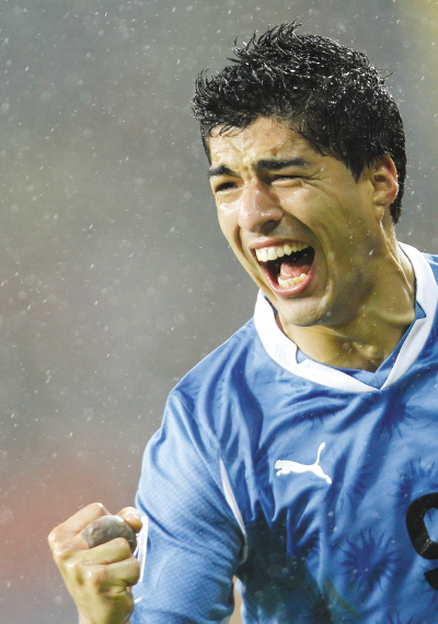 苏亚雷斯——乌拉圭前锋,23岁,荷甲劲旅阿贾克斯队队长。在上赛季的联赛中,苏亚雷斯以48粒进球成为荷甲历史上自范巴斯滕之后最闪亮的球员。本届世界杯上苏亚雷斯共出场5次,场场首发,打进3球;小组赛1:0击败墨西哥攻进了制胜一球,确立了乌拉圭A组头名的位置,八分之一决赛面对韩国更是梅开二度,其中制胜的第二球划出一道诡异的弧线,尽显苏亚雷斯的杀手本色。他与西甲马德里竞技前锋弗兰构成的锋线组合是乌拉圭实力的根本,也是对手防范的重点,苏亚雷斯在本届世界杯上目前已被对手犯规20次,排第二位。由于在对阵加纳的四分之一决赛中故意伸手挡出了一个必进球,苏亚雷斯被红牌罚下,将缺席与荷兰的半决赛。从乌拉圭民族队起步的苏亚雷斯登陆欧洲时,其身价仅为80万欧元;阿贾克斯收购他时出价750万欧元,目前他的预估价已达3000万欧元。