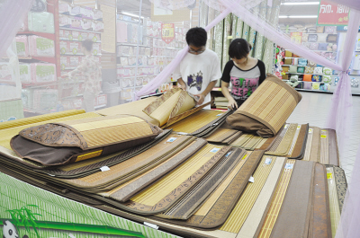记者在市区某大型超市的床上用品处发现,藤席、草席、竹炭席等,都被摆放在醒目位置,成了今夏的主打产品,有不少市民正在选购。凉席价格从几十元到上千元不等,一般藤席的售价在两三百元左右,最贵的数牛皮席,售价要1800多元。“以前我家用的都是麻将席,比较凉快,但经常不小心被夹到肉,今年打算换种凉席。”