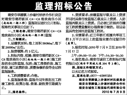瑞安市莘塍镇上沙塘村经济合作社决定对瑞安市瑞祥新区C4—C6地块商住小区(南地块一期工程)监理项目进行公开招标,现将有关事项公告如下: