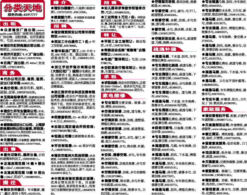●天瑞家政:空调拆装修、加液,维修家电:65691299。