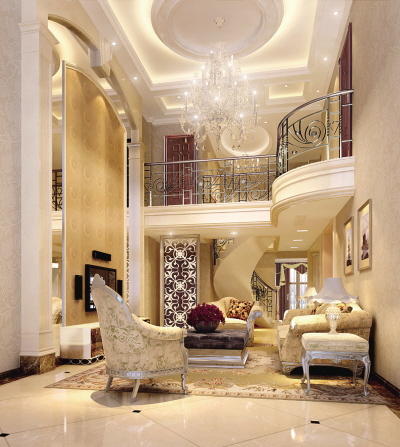 这一风格在丽园设计师的这份案例中便是一个完美的呈现:沙发背景的墙纸与大理石颜色,相互呼应,使得一丝淡雅的气息弥漫于空气之中。透明的大型玻璃框装饰电视机背景,既突显出精致的空间亮点,又很好的扩展了空间的视觉效果,庄重气派、精雕细琢、优雅高贵,散发着浓浓的艺术气息。茶几沙发将新古典的线条完美地融入空间氛围中,让人感受到无法忽视的高贵与优雅。在客厅与楼梯的过道处,以典雅的雕花艺术来强调欧式的豪华与贵气。在吸顶大型灯池的运用上,实为画龙点睛,华美又生动。