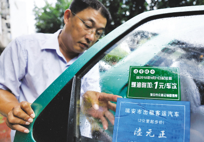 “请问您去哪?今天开始要加收燃油附加费了,每车次1元钱,请您配合。”昨天中午11时许,记者在万松东路拦了一辆出租车,刚拉开车门,师傅就迫不及待地解释起“新政”,而出租车车厢上都统一张贴了加收燃油附加费的提示标志(如图)。随后,记者采访了几位早高峰期间出行打的的乘客,他们都表示刚上车,出租司机就主动提醒乘客要加收燃油附加费了。