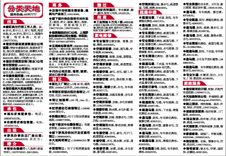 ●天瑞家政:空调拆装修、加液,维修家电:65691299。