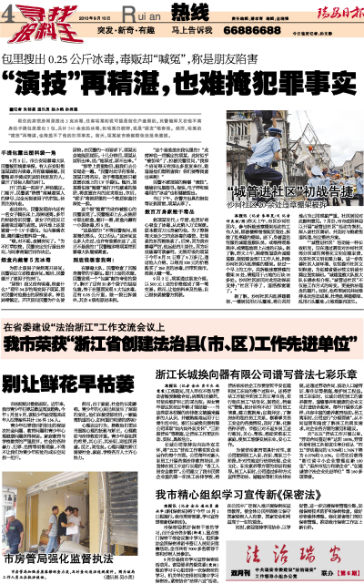 本报讯(记者 金汝 实习生 赵雯雯)工伤期间,用人单位不得与劳动者随便解除合同;房屋阳光被挡,可依法维护自己的采光权;男女青年要达到法定年龄才能结婚……当这些原本枯燥的法律条文被越来越多的人认识,并被熟练地运用于日常生活中时,浙江长城换向器有限公司采取“岗内岗外双关怀”、“三阶段普法”等措施,让普法工作更加生动、实际、具备活力。