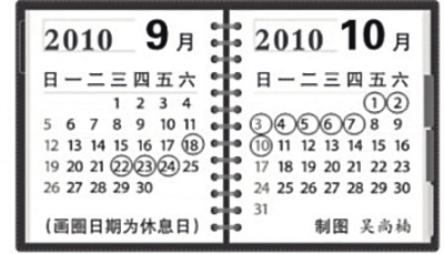 9月13-17日上班,9月18日休息,9月19日-9月21日上班,9月22日-9月24日休息,9月25日-9月30日上班,10月1日-10月7日休息,10月8日-10月9日上班,10月10日又休息……也就是说从9月13日至10月10日两节前后,工作日和休息日被分割成了“8个段落”。