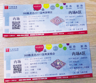 6月18日,陈奕迅将在温州举行演唱会。我买了两张演唱会门票,但是当天与公司安排的旅游时间起了冲突,没办法去看演唱会了。现在我想将这两张门票转让给有兴趣的朋友。