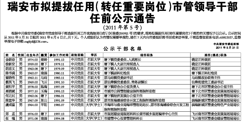 瑞安市拟提拔任用(转任重要岗位)市管领导干部