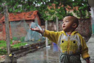 5月31日,久旱的洪湖市下起小阵雨,一名安置在湖北省洪湖市螺山镇界牌福利院的小朋友用手接雨。