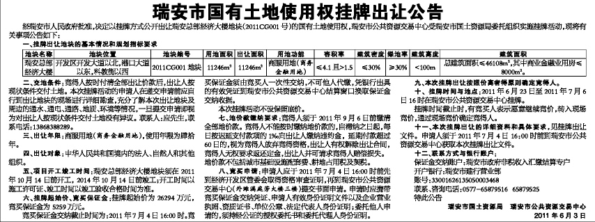 十、挂牌时间与地点:2011年6月23日至2011年7月6日16时在瑞安市公共资源交易中心挂牌。