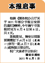放假期间,瑞安日报版面调整如下:6月6日(星期一)休刊一期,6月7日(星期二)起恢复正常出刊。