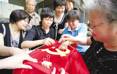 日前,西门河头社区党员在大红旗上穿针引线绣党徽。当天,西门河头社区党员利用休息日,开展党员集体绣党旗活动。党员们一边深情地唱着耳熟能详的《绣红旗》,一边认真地穿针引线,把对祖国、对党的热爱融汇在一针一线当中,迎接建党90周年。