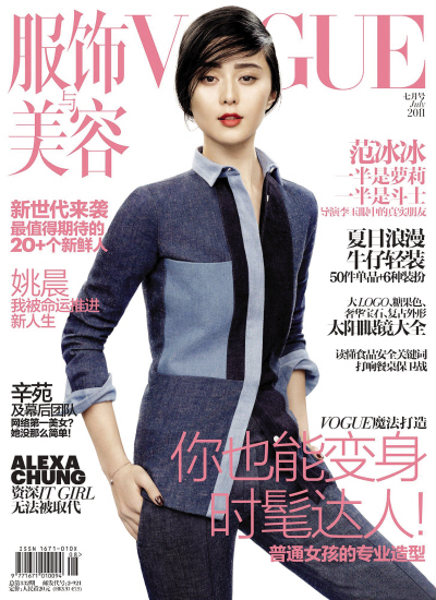 2011年7月号的《VOGUE》(《服饰与美容》)封面中,范冰冰的独特造型展示了2011秋冬款发型,再搭配今年最流行的调整脸部明暗差距、放大双眼比例、丰润双唇美感的超立体3D心机妆容,中性风又带有女人味。