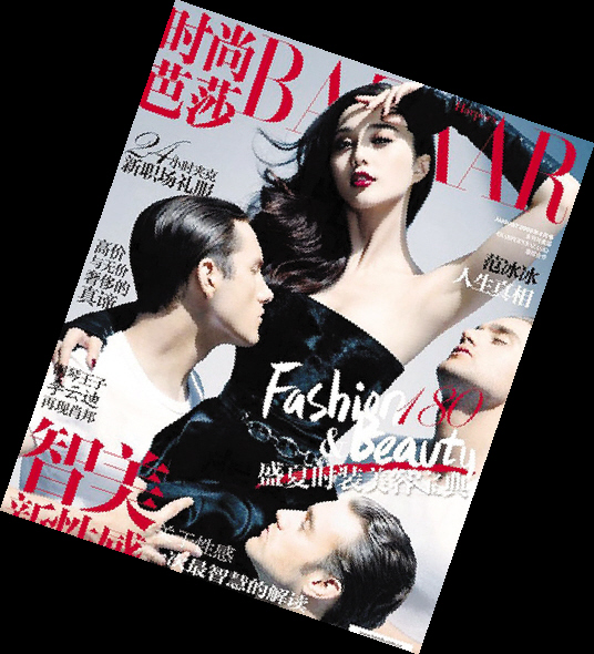 在2009年8月的《BAZZAR》(《时尚芭莎》)封面中,范冰冰拍摄了一组男人们围绕在她身边的性感照片,有一种众星捧月的感觉。