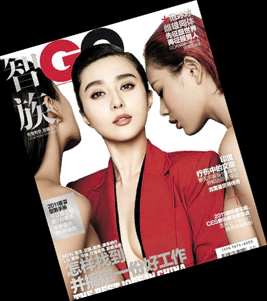 2011年3月号《GQ》(《智族》)的封面大片中,“范爷”成了主角,用两个妩媚的女人衬托范冰冰的爷气,很有创意。