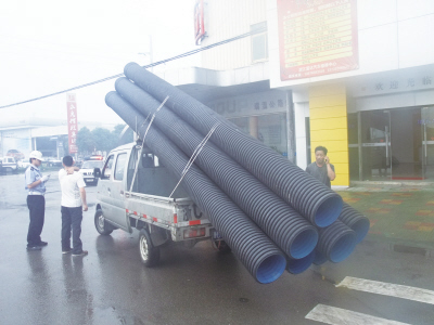 近日,交警莘塍中队民警在104国道吴泰集团路口执勤时,查扣了一辆严重超长的微型货车,车上载的管子几乎超出车身两倍。