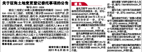 兹有土地受让申请人张德冠提供瑞集用(2010)字第104-1210号土地证、安阳镇上望字第00005167号房产证、房屋买卖协议书、完税凭证、委托书、具结声明书等材料,来我局申请办理坐落在瑞安市上望街道九一村望荣北路62.64号五层、土地面积18.68平方米、使用权类型拨用的土地使用权转让变更登记的要求。经审查,该宗地原土地权利人(转让方)胡碎国、胡建楷,因不能亲临我局现场共同签字办理土地变更登记相关事项,特此公告征求意见。如土地权利相关人对以上公告有异议的,请在公告之日起7日内将书面意见反馈到市国土资源局土地登记交易中心。逾期我局将予以办理变更登记。