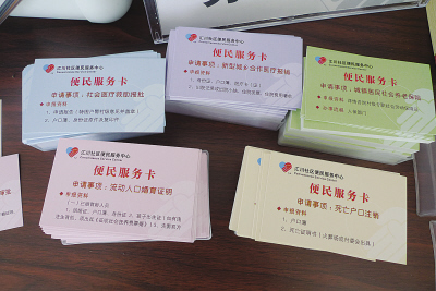 在湖岭镇汇川社区便民服务中心大厅办公桌上,摆满了一盒盒五颜六色的小卡片,仔细一看,上面印着“便民服务卡”、“申请事项”等字样,每盒卡片颜色不一,内容各异。绿卡上印着“城镇居民社会养老保险”,蓝卡上印着“社会医疗救助报批”……