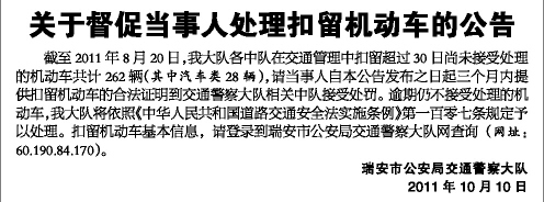 截至2011年8月20日,我大队各中队在交通管理中扣留超过30日尚未接受处理的机动车共计262辆(其中汽车类28辆),请当事人自本公告发布之日起三个月内提供扣留机动车的合法证明到交通警察大队相关中队接受处罚。逾期仍不接受处理的机动车,我大队将依照《中华人民共和国道路交通安全法实施条例》第一百零七条规定予以处理。扣留机动车基本信息,请登录到瑞安市公安局交通警察大队网查询(网址:60.190.84.170)。
