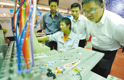 本报讯(记者 陈成成/文 孙凛/图)一款被誉为“最聪明的滴塑机”,生产16块塑料卡通人物只需1分51秒;一款电动攻丝机打一个螺丝孔仅需三四秒钟,且利用其灵活的旋转头,使得原本麻烦的操作程序变得更为简便,即使是外行人也很容易就能学会……10月8日上午,第五届浙江瑞安机械装备展览会在市体育馆开幕。来自国内的300多家企业带来上万款产品,吸引了全国各地客商前来参观采购,其中参展的温州本土企业就达60多家。