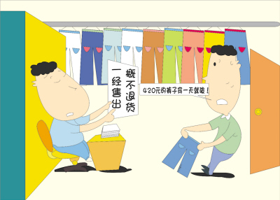 “十一”期间,除了家电市场折扣活动吸引顾客,服装生意也很火热,因此也出现了不少纠纷,主要集中在产品质量和促销价格方面的纠纷。10月4日,姚先生在市区虹桥路一家服装店购买了一件价格420元的裤子,可穿了不到一天线脚破了,要求更换或退款遭到店家拒绝,于是拨打了“12315”投诉热线。后经工商人员调解才得以调换。