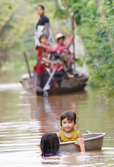 10月10日,在柬埔寨干丹省,一名女孩推着坐在盆子里的妹妹在洪水淹没的街道上行走。