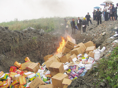 本报讯(记者 严小章)昨日上午,一辆辆满载问题食品假冒伪劣产品的货车开进位于市废品回收站内的一片空地上,市质监局在近十米深的焚烧坑集中销毁近2吨问题食品和假冒伪劣产品,涉及20个品种,总货值近150万元。
