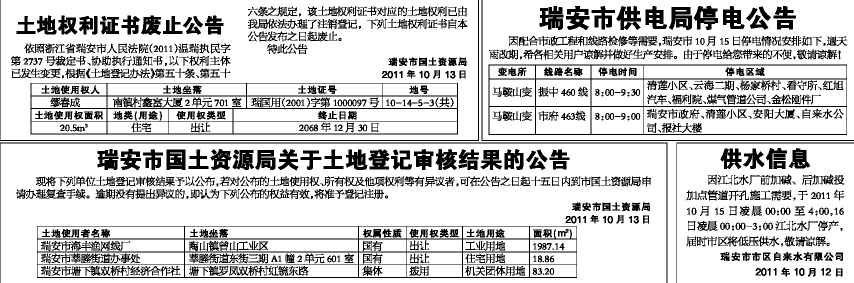 依照浙江省瑞安市人民法院(2011)温瑞执民字第2737号裁定书、协助执行通知书,以下权利主体已发生变更,根据《土地登记办法》第五十条、第五十六条之规定,该土地权利证书对应的土地权利已由我局依法办理了注销登记,下列土地权利证书自本公告发布之日起废止。