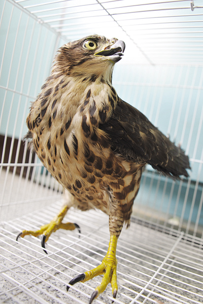昨日下午,绿眼睛野生动物保护组织已接走这只凤头鹰,并将它送到救护站饲养。