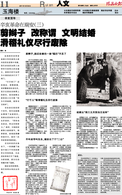林炜然先生在《辛亥革命在瑞安》中写道:“革除满族强加于我族的各项风俗习惯:首先是男人剪去辫子,未剪得也扎成发锥或盘在头上。脑后挂着一条尾巴的怪状是不见了。”