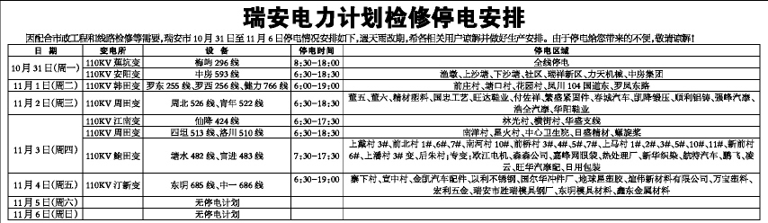 因配合市政工程和线路检修等需要,瑞安市10月31日至11月6日停电情况安排如下,遇天雨改期,希各相关用户谅解并做好生产安排。由于停电给您带来的不便,敬请谅解!