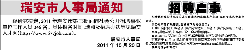 经研究决定,2011年瑞安市第三批面向社会公开招聘事业单位工作人员346名。具体报名时间、地点及招聘办法等见瑞安人才网(http://www.577job.com)。
