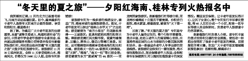 据了解,为满足广大中老年朋友的出游愿望,本着“诚挚关爱老人、构建和谐社会”的宗旨,中国老年学会老年旅游专业委员会、温州星远旅游服务有限公司特联合瑞安市新潮国际旅行社,共同推出温州首趟“冬天里的夏之旅”大型夕阳红旅游专列。该旅游团11月20日温州始发,全程11天享受桂林山水、海南风光, 价格仅为2480元/人起,全程专列卧铺游!