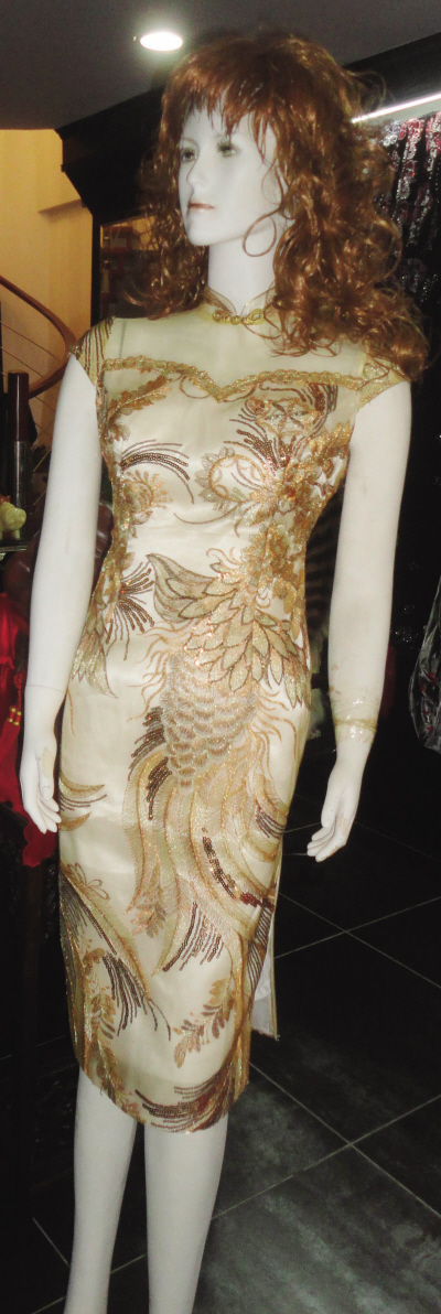 早在上世纪90年代,凤玉旗袍绸缎楼的负责人应凤玉就将现代服装的流行元素融入旗袍中,以自己的名字“应凤玉”为旗袍注册了商标。“现在传统旗袍一般都进行了改良,比如把斜襟改成圆襟、偏襟,增加刺绣图案;旗袍领口的设计也不仅仅是竖领,小翻领、立领,甚至圆领。这就是时代的变迁和时尚的变化。我们还将旗袍的开衩由短变高,并将原来的连袖改成短袖或没袖。”应凤玉介绍道。她经营旗袍行业已有30多年,先后收了几十位学徒。如今,她的学徒们不仅在市区开店,还在陶山、塘下、飞云、马屿等地,开有旗袍成衣店,将这门传统手艺传承下去。不久前,应凤玉还设计一款中西合璧的礼服,上身像旗袍,下身像礼服,还有着长长的拖尾。温州一新娘很是喜欢,订做并穿上这款礼服亮相婚礼时,可谓艳惊四座。因为旗袍制作工艺讲究、复杂,订做一件旗袍价格不低,一般的要800来元,有的则要上千元。