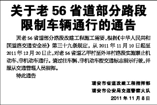 因老56省道部分路段改建工程施工需要,根据《中华人民共和国道路交通安全法》第三十九条规定,从2011年11月10日起至2011年12月20日止,对老56省道乙甲村至外垟村路段实施禁止机动车、非机动车通行。请过往车辆、非机动车按交通标志指示行驶,并服从交通管理人员指挥。