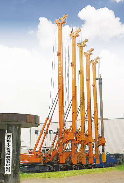 昨日上午,记者走进曾经制造出“神州第一锤”——中国功率最大振动锤的浙江振中工程机械有限公司,大门左边的空地上整齐地排列着五六台新研发出来的全液压旋挖钻机,高高立起的“铁臂”高达近20米,分外引人注目。