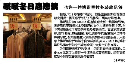 据悉,2011年感恩节期间,博斯里拉服饰在瑞安国际大酒店二楼国禧厅举行了品牌推广酬宾专场活动。