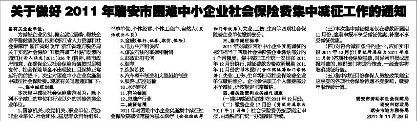 关于做好2011年瑞安市困难中小企业社会保险费集中减征工作的通知