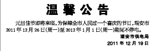 元旦佳节即将来临,为保障全市人民过一个喜庆的节日,瑞安市2011年12月26日(周一)至2012年1月1日(周一)期间不停电。