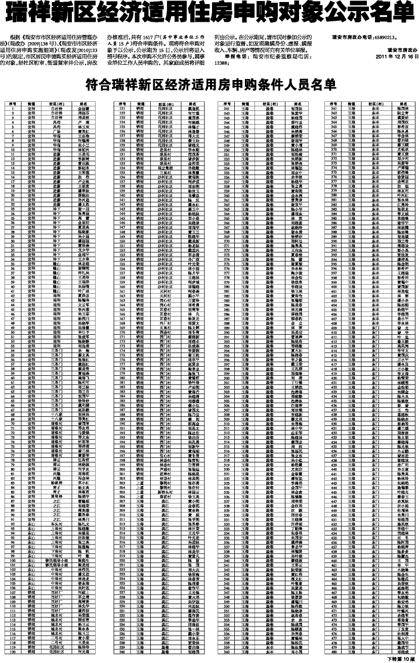 瑞祥新区经济适用住房申购对象公示名单