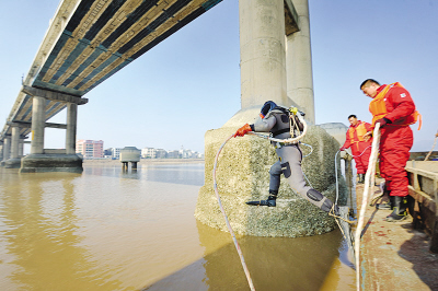 “水流缓慢了,可以下水了!”10时35分许,潜水员“扑通”一声跳入水中,游向桥墩,一眨眼的工夫便从水面消失了。